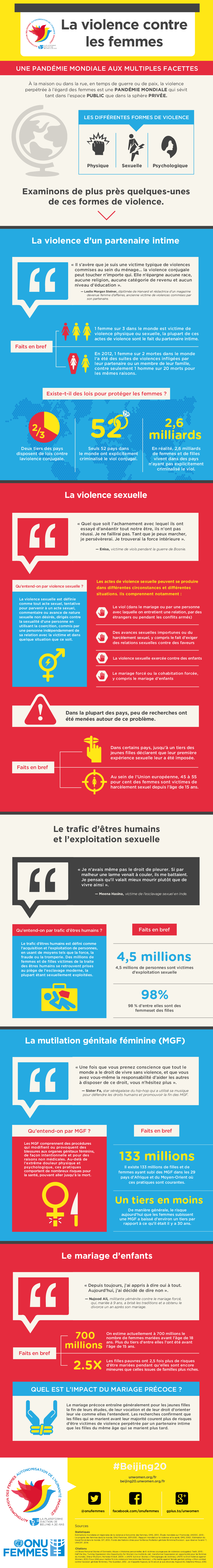 Le 25 novembre a été choisi pour symboliser la lutte contre les violences faites aux femmes. Certes insuffisante, elle permet de marquer sur l’agenda international, un drame persistant dans nos sociétés, celui des violences et discriminations que subissent les femmes dans leur quotidien. Viols, agressions sexuels, agressions physiques, harcèlement sexuel, mariage précoce et forcé, les violences envers les femmes prennent de multiples formes. Malgré les instruments juridiques de protection des droits des femmes, l’action collective des organisations internationales, non gouvernementales et communautaires ces violences persistent et produisent de nombreuses victimes. Les chiffres sont effrayants et révèlent brutalement les différentes atteintes à la dignité dont elles font l’objet. Entre 100 et 140 millions de jeunes filles et femmes ont subis des mutilations génitales, une femme sur trois dans le monde est victime de violences physiques ou sexuelles, 4,5 millions de personnes sont victimes d’exploitation sexuelle dont 98% sont des filles et des femmes.